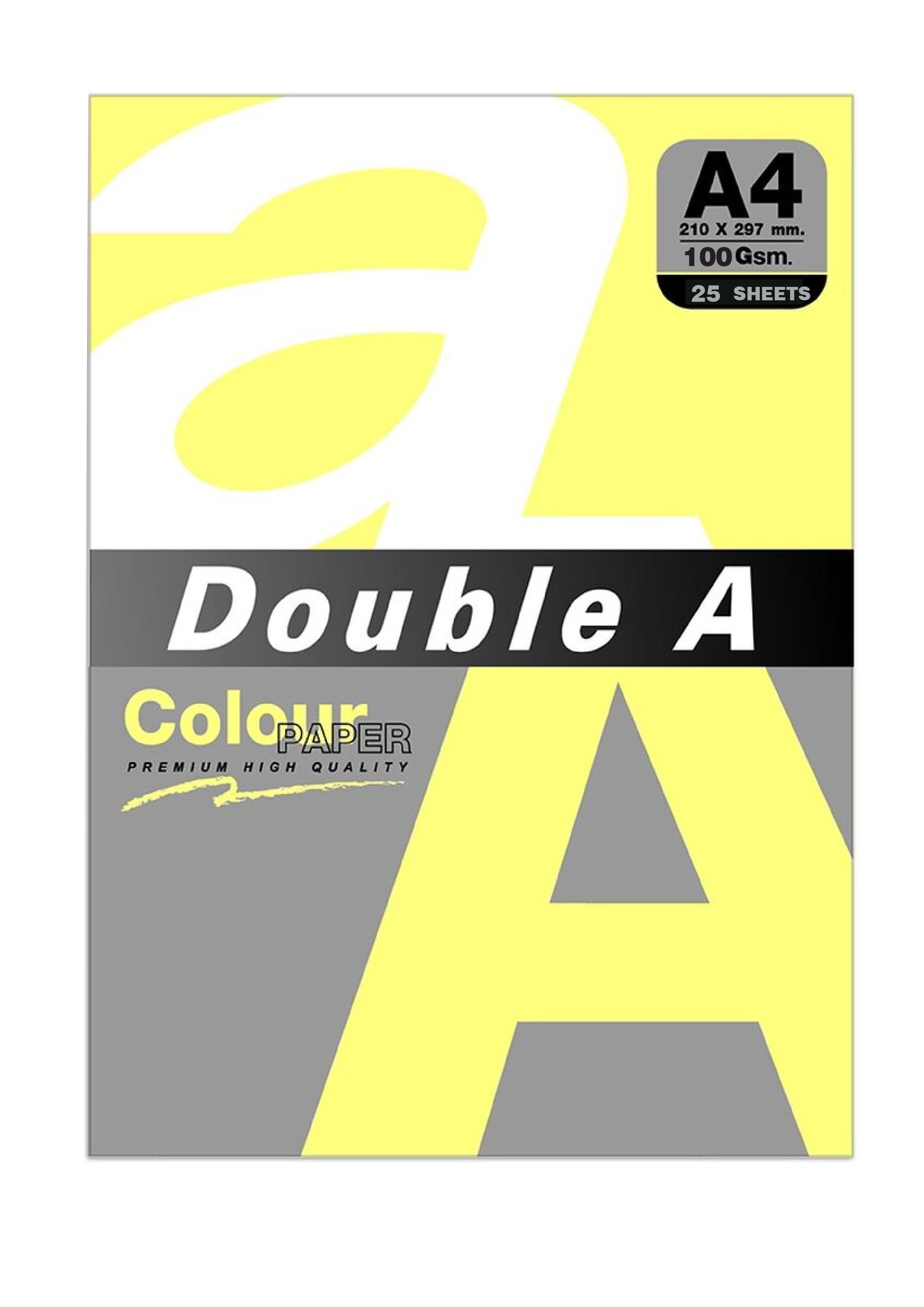 Double A กระดาษสี กระดาษถ่ายเอกสาร A4 หนา 100 แกรม 25 แผ่น – Double A กระดาษสี A4 หนา 100 แกรม – สีเหลืองสะท้อนแสง – กระดาษสีคุณภาพดี สีสม่ำเสมอ เรียบเนียน ไม่ติดเครื่อง – ขนาด A4 (210×297 mm.) หนา 100 แกรม 25 แผ่นต่อแพ็ค – เหมาะสำหรับงานถ่ายเอกสาร งานพิมพ์ หรืองานศิลป์