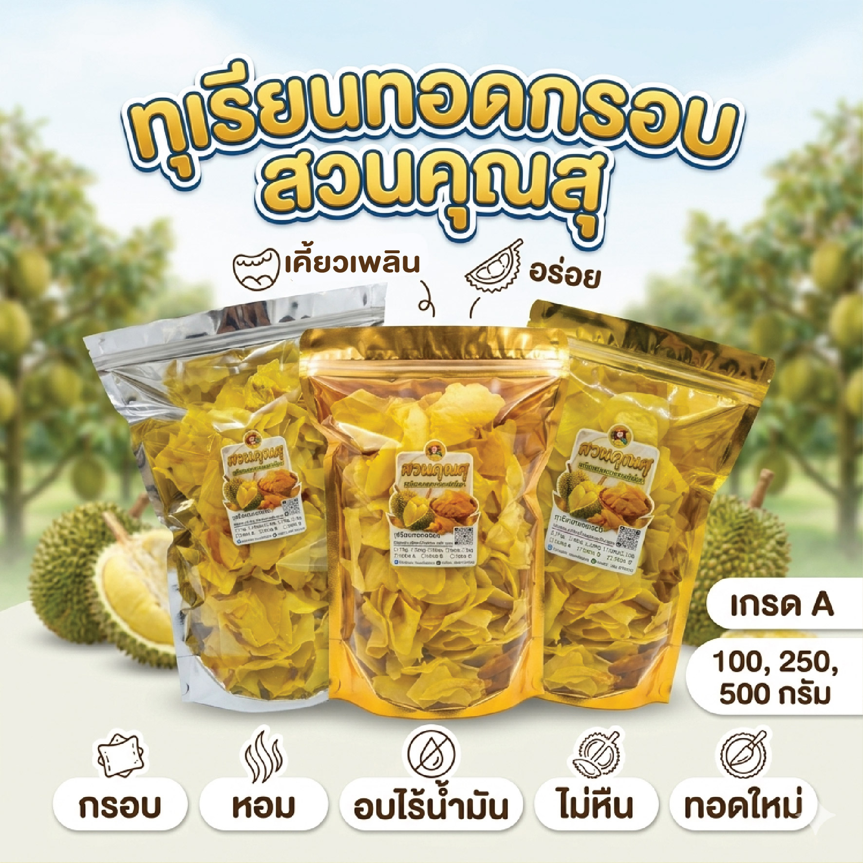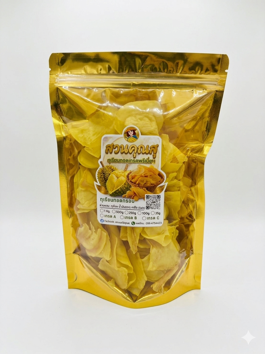 ทุเรียนทอดแท้ 100% เกรด A จากจันทบุรี [อบไล่น้ำมัน] กรอบ หอม มัน ไม่หืน ทอดใหม่ๆ รสชาติกลมกล่อม หวานธรรมชาติจากเนื้อทุเรียนแท้