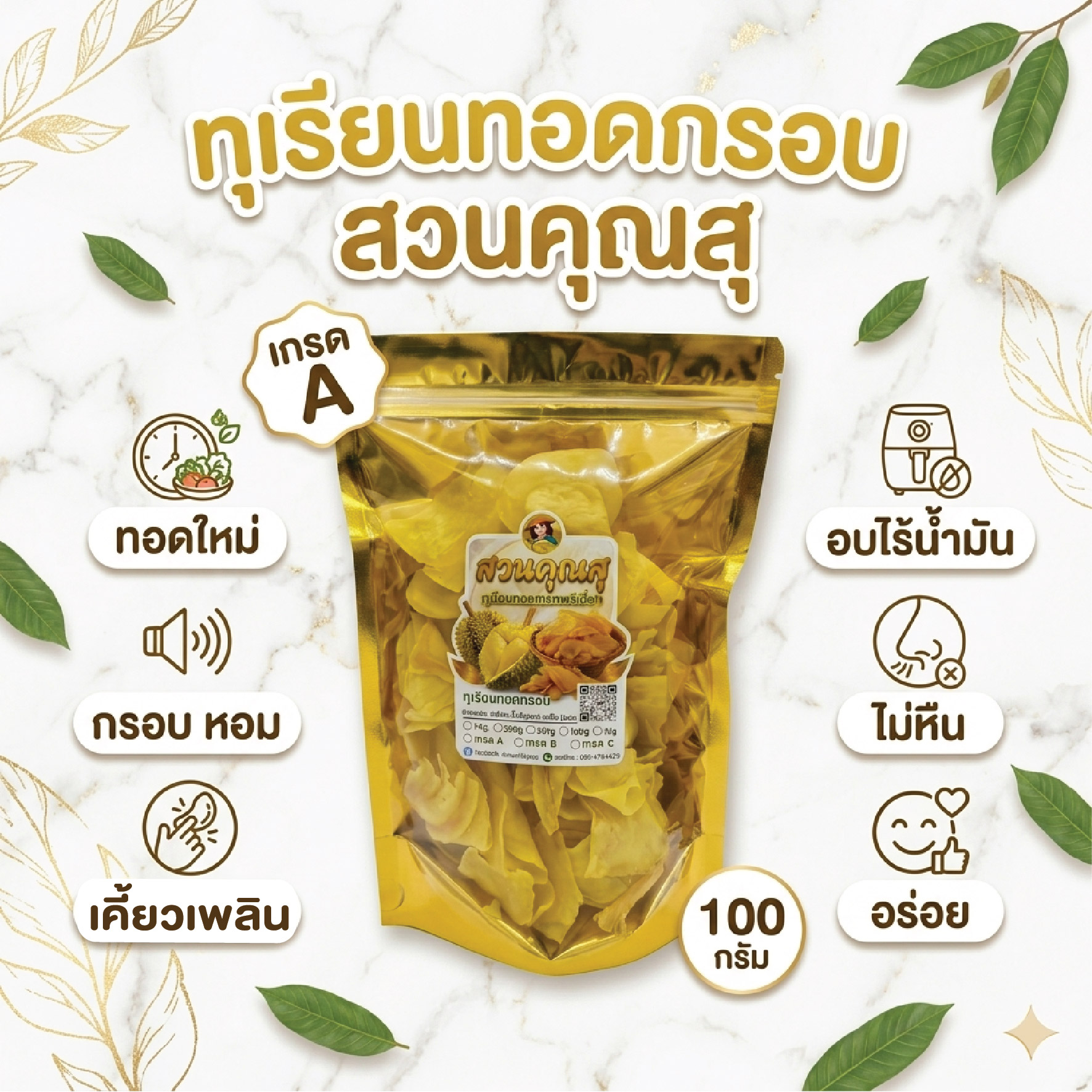 ทุเรียนทอด 100% พรีเมี่ยม เกรด A ขนาด 100 กรัม (1ถุง) กรอบ หอม มัน ไม่หืน ทอดใหม่