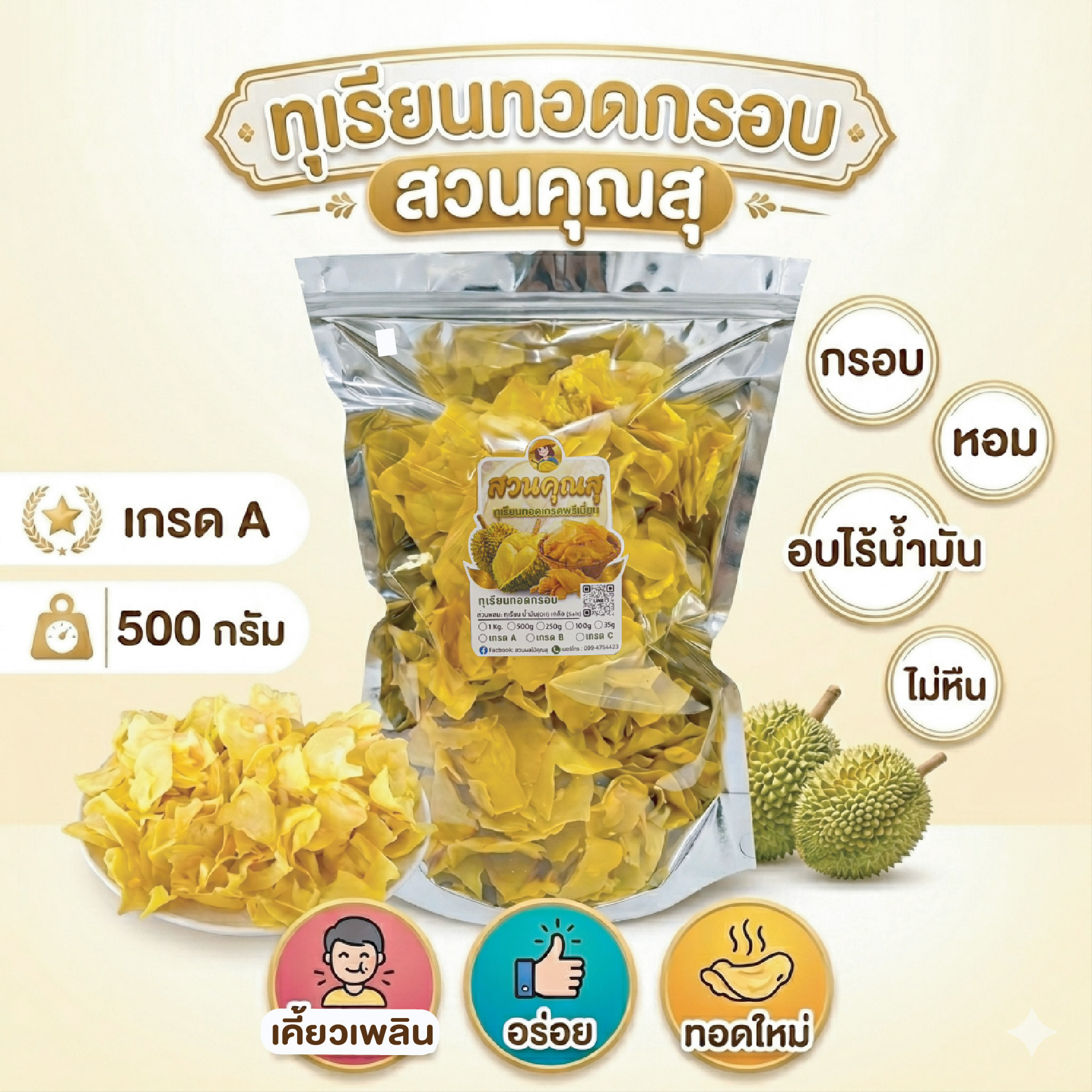 ทุเรียนทอด 100% พรีเมี่ยม เกรด A ขนาด 500 กรัม (1ถุง) กรอบ หอม มัน ไม่หืน ทอดใหม่