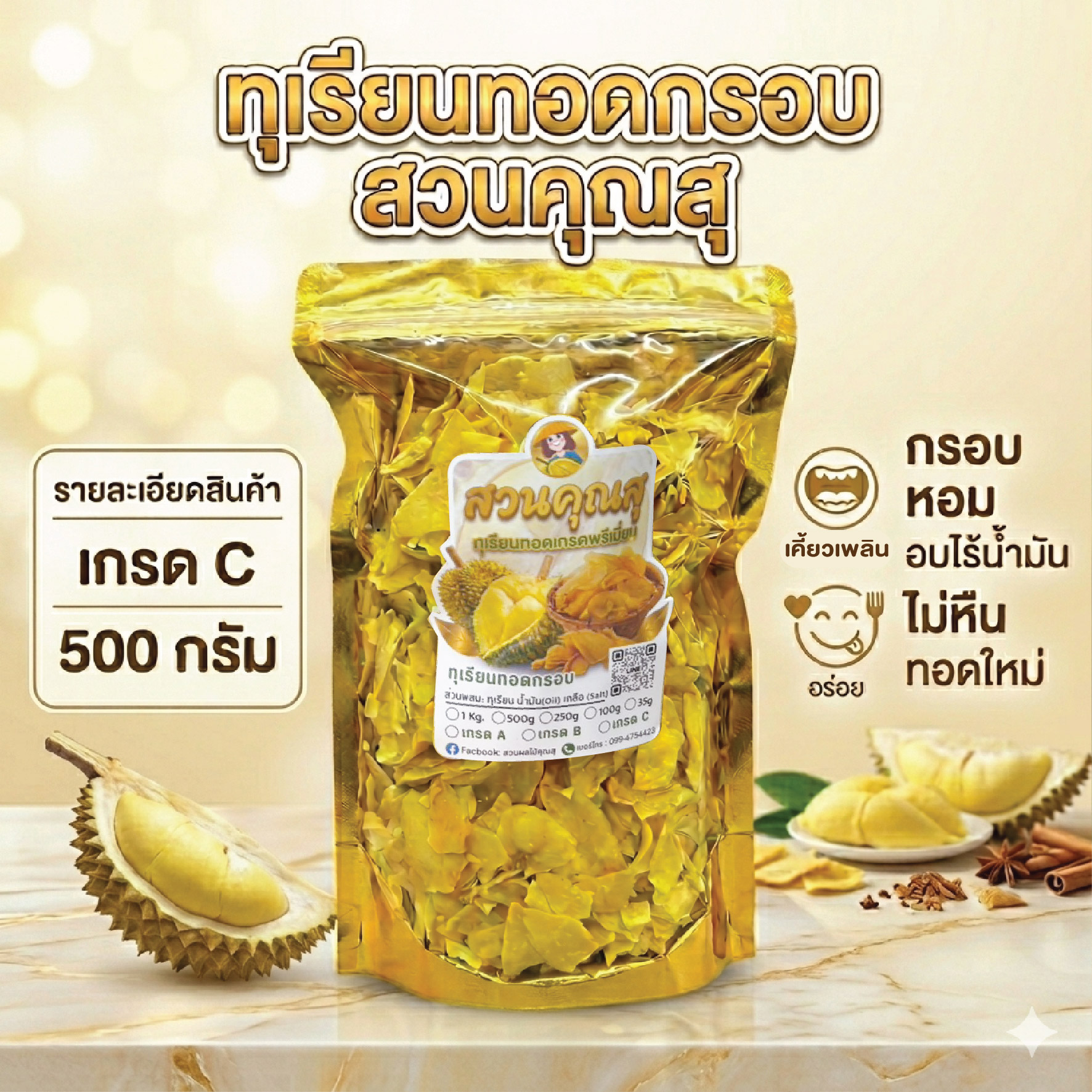 ทุเรียนทอด 100% พรีเมี่ยม เกรด C ขนาด 500 กรัม (1ถุง) กรอบ หอม มัน ไม่หืน ทอดใหม่