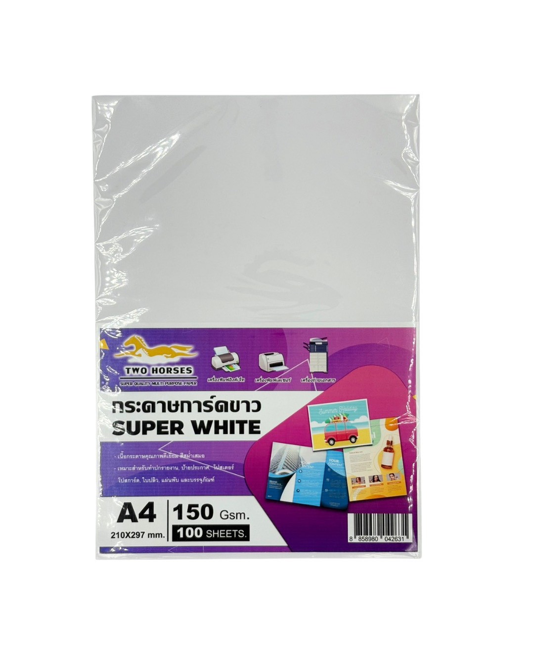 การ์ดขาว Super White ขนาด A4 หนา 150 แกรม ( 210 x 297 มม.) ขาวสว่าง เนื้อเรียบเนียน บรรจุ 100 แผ่น