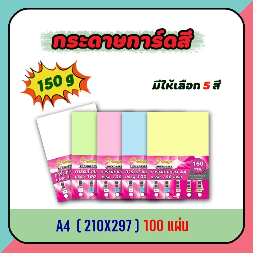 กระดาษ การ์ดสี ขนาด A4 หนา 150 แกรม ( 210 x 297 มม.) พื้นผิวเรียบ บรรจุ 100 แผ่น