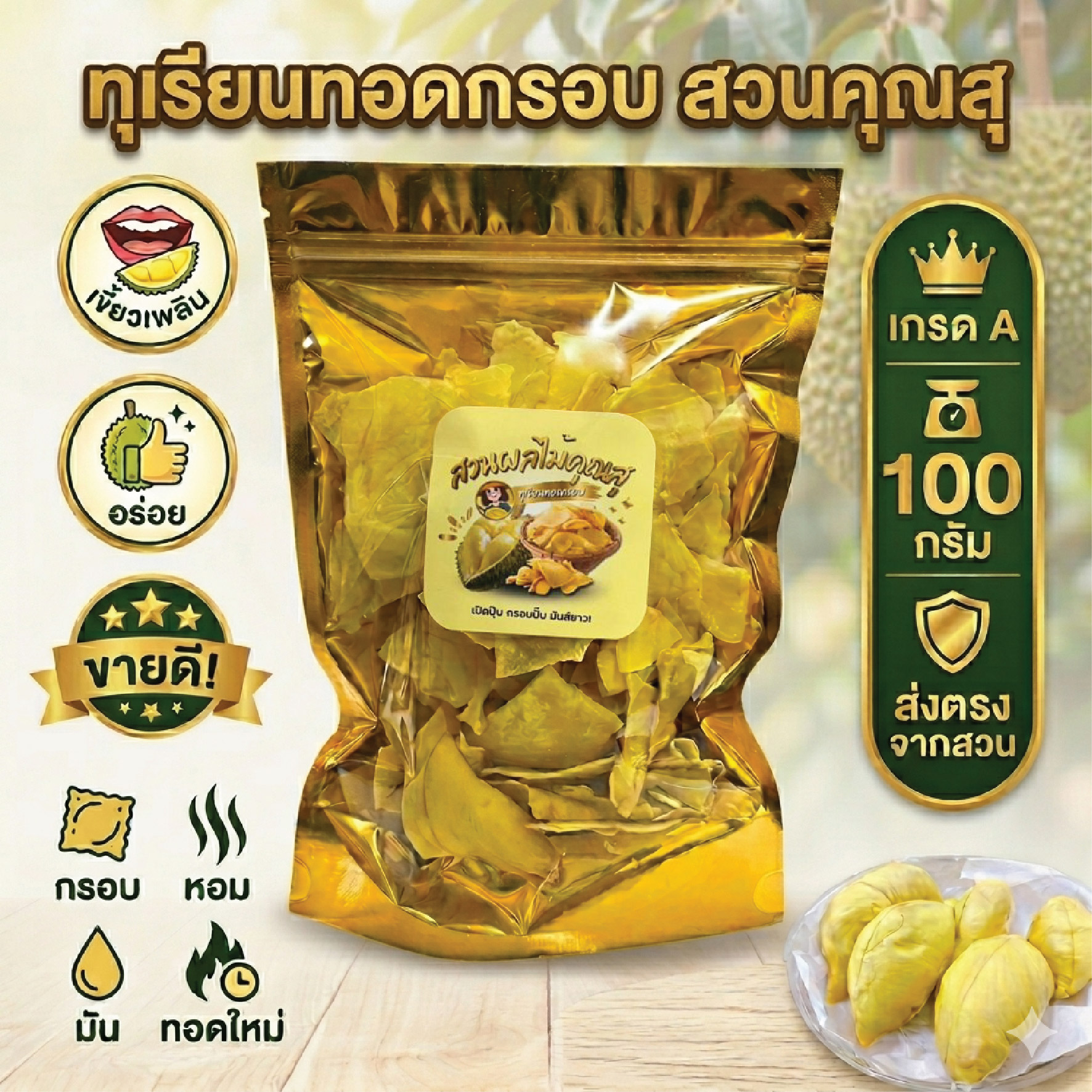 ทุเรียนทอดแท้ 100% เกรด A จากจันทบุรี [อบไล่น้ำมัน] กรอบ หอม มัน ไม่หืน ทอดใหม่ๆ รสชาติกลมกล่อม หวานธรรมชาติจากเนื้อทุเรียนแท้