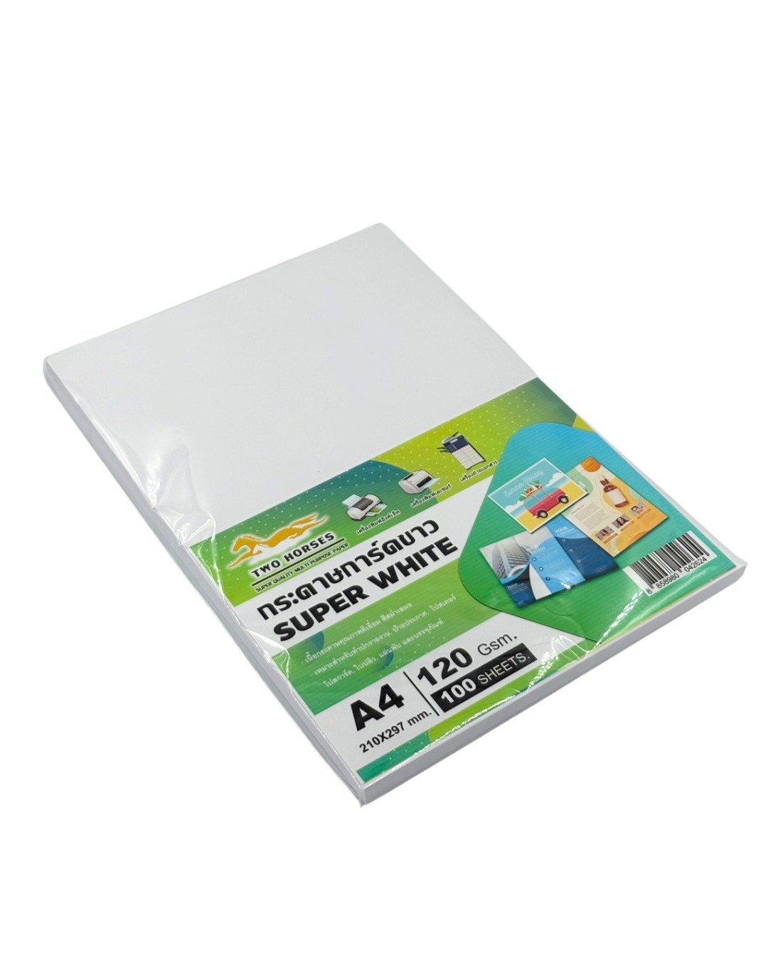 การ์ดขาว Super White ขนาด A4 หนา 120 แกรม ( 210 x 297 มม.) ขาวสว่าง เนื้อเรียบเนียน บรรจุ 100 แผ่น